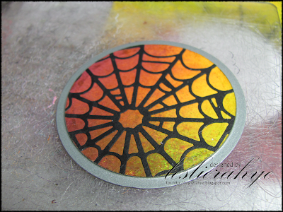 I began by misting white paper with colors of the season! Once dry, I die cut the largest scallop die in the XL-5 series for my tussy mussy. I then placed a die cut spiderweb doily onto another piece of the misted paper and die cut a small circle and scalloped circle.