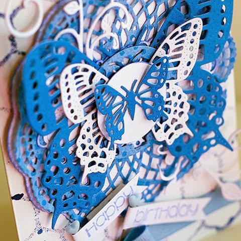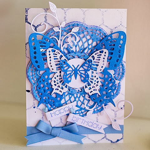To create the card I have used a white card base and a chicken wire mask … sprayed it in a coordinating blue mist (I used Tattered Angels Sapphire). I have then cut out the angel wing from the Lilith Doily w/ Angel Wing - DL263 in white cardstock and inked the edges and topped it with the Lilith Doily cut in blue. I have stacked the Exotic Butterfly X-tra Large – DL119, Exotic Butterfly Medium #2 – DL115 and the Small Exotic Butterflies #1 w/Angel Wings – DL112AB with some of the other stackers in between. Finished the card with a couple of the Mini Fanciful Flourish – B117S and some ribbon and stamped pick pins.